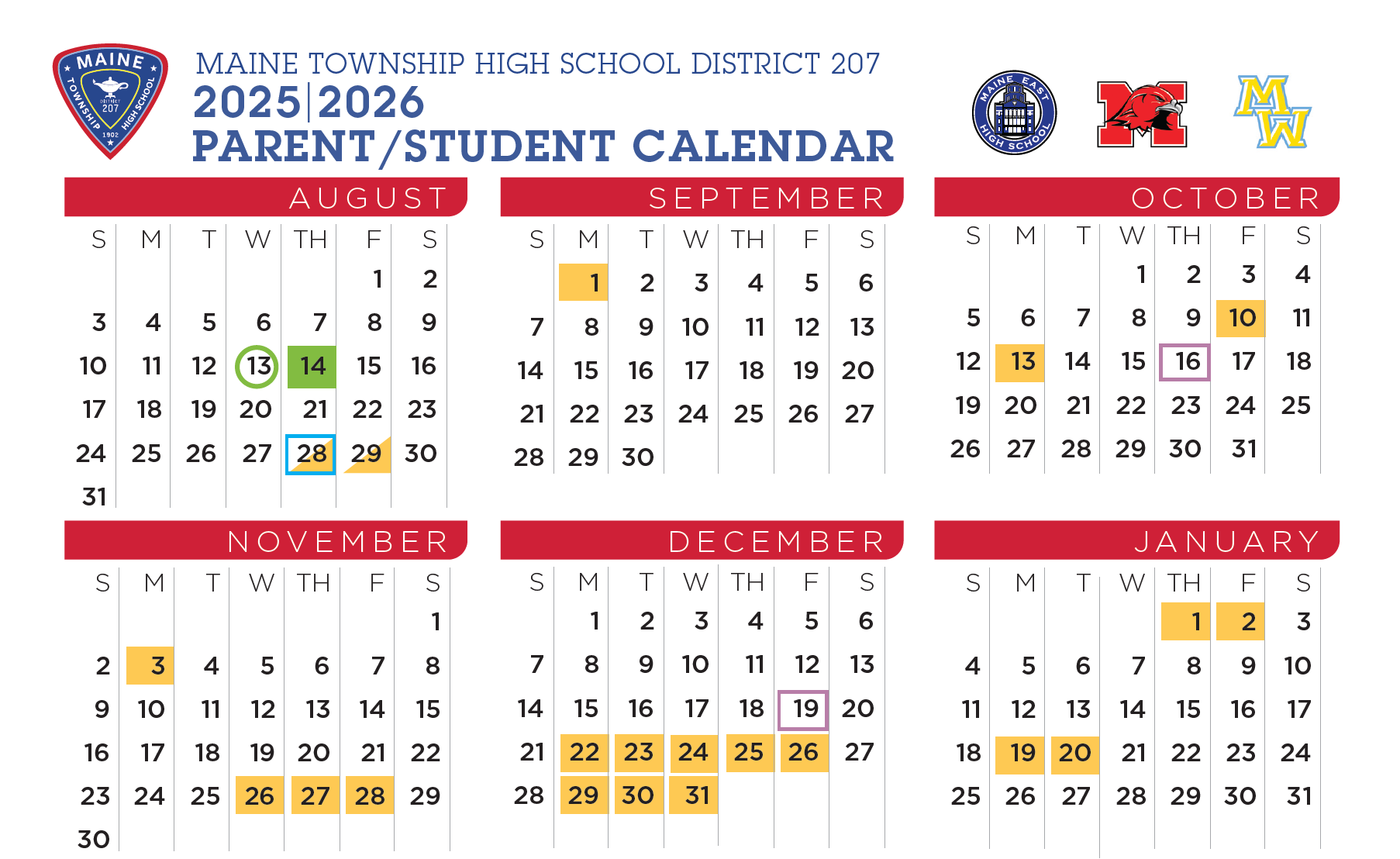 This calendar was created in consultation with the elementary school districts located within the District 207 boundaries. The winter and spring breaks in District 207 align with those partner districts.